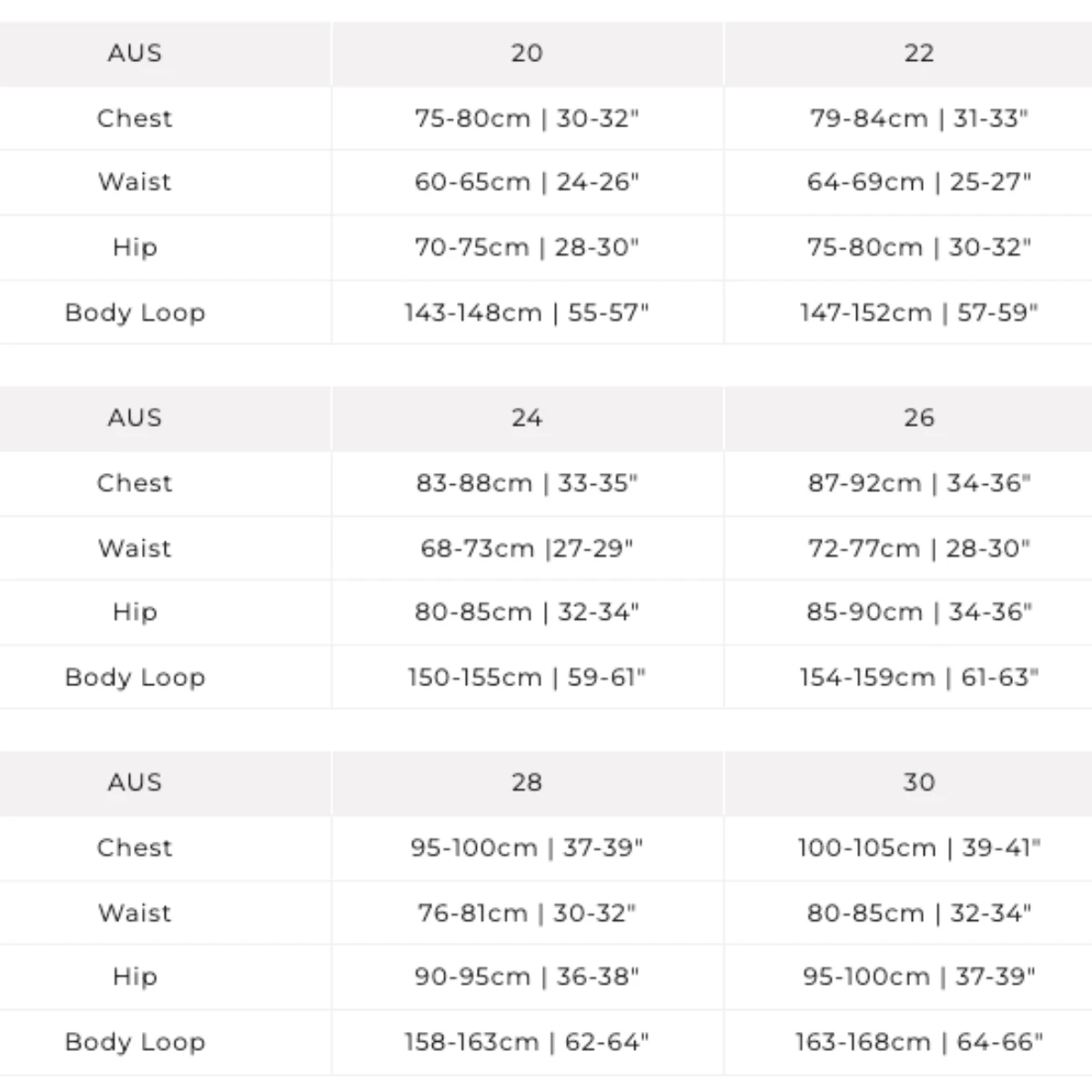 | Body Loop | 143-148cm | 55-57″ | 147-152cm | 57-59″ | 150-155cm | 59-61″ | 154-159cm | 61-63″ |