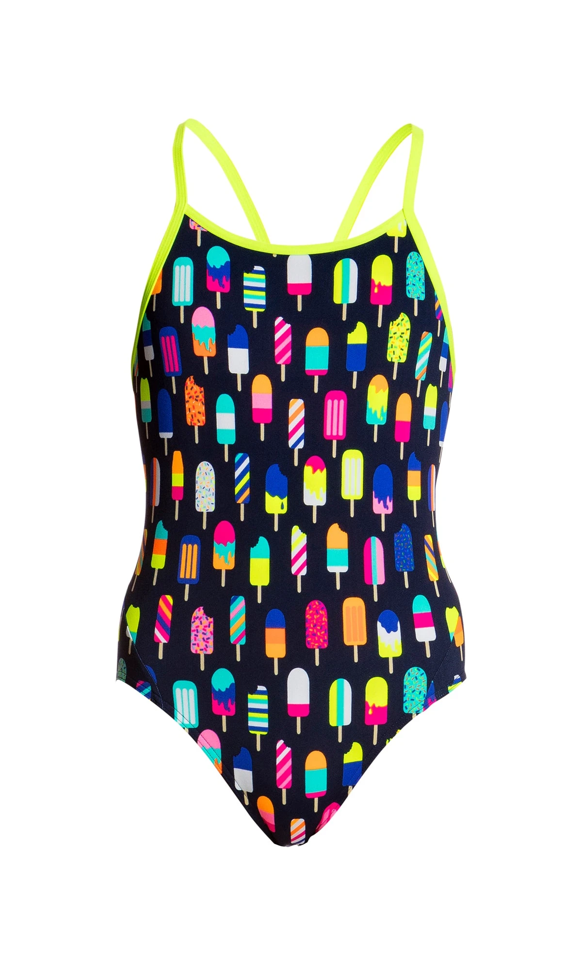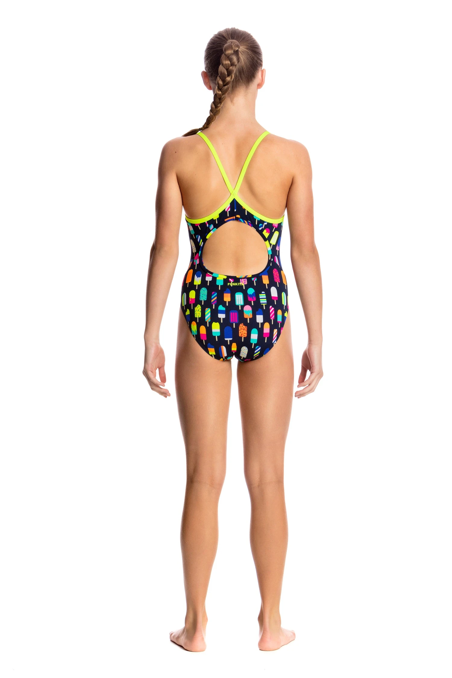 Our classic training style with signature diamond back strap finish and modest rear coverage is perfect for lap sessions. Features a circular cut-out back. With front lining and Funkita embroidery, this easy style says it all. Available in girls’ sizes 8 – 14.